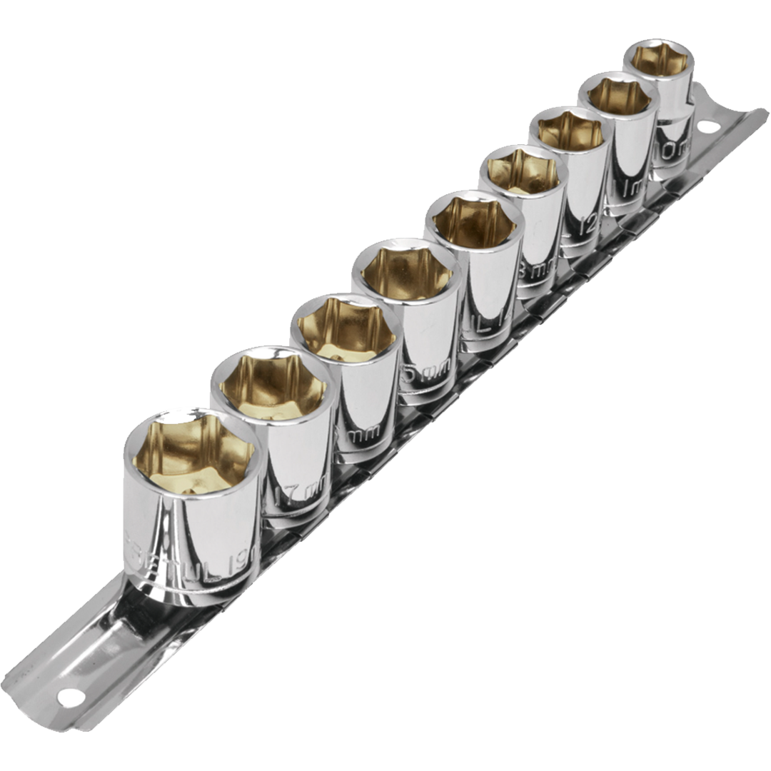El Juego de 9 dados cuadro de 3/8' métrico de Pretul es ideal para aquellos que requieren precisión y resistencia en su trabajo de mecánica y reparación.