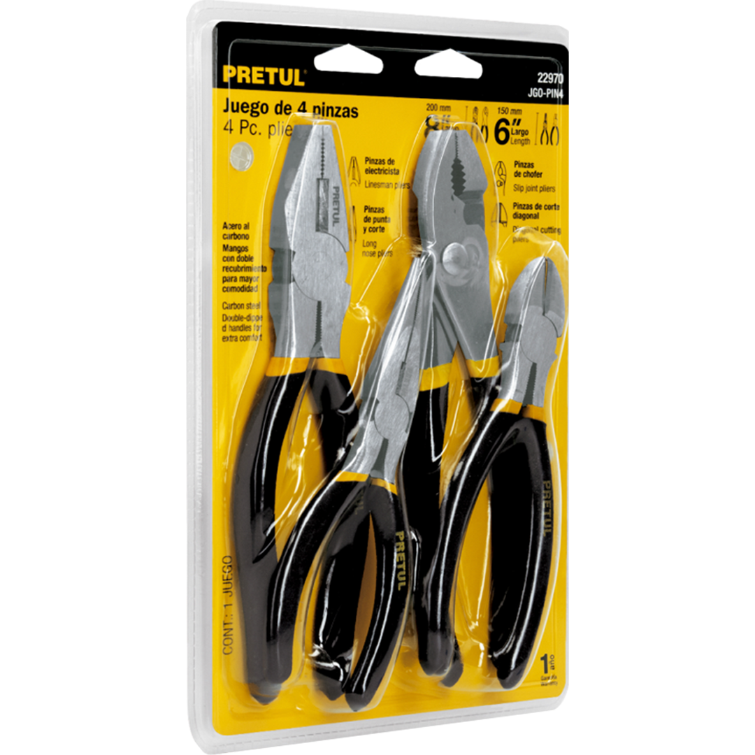 Conjunto de pinzas Pretul diseñado para trabajos eléctricos, mecánicos y generales, con mangos cómodos y resistentes.