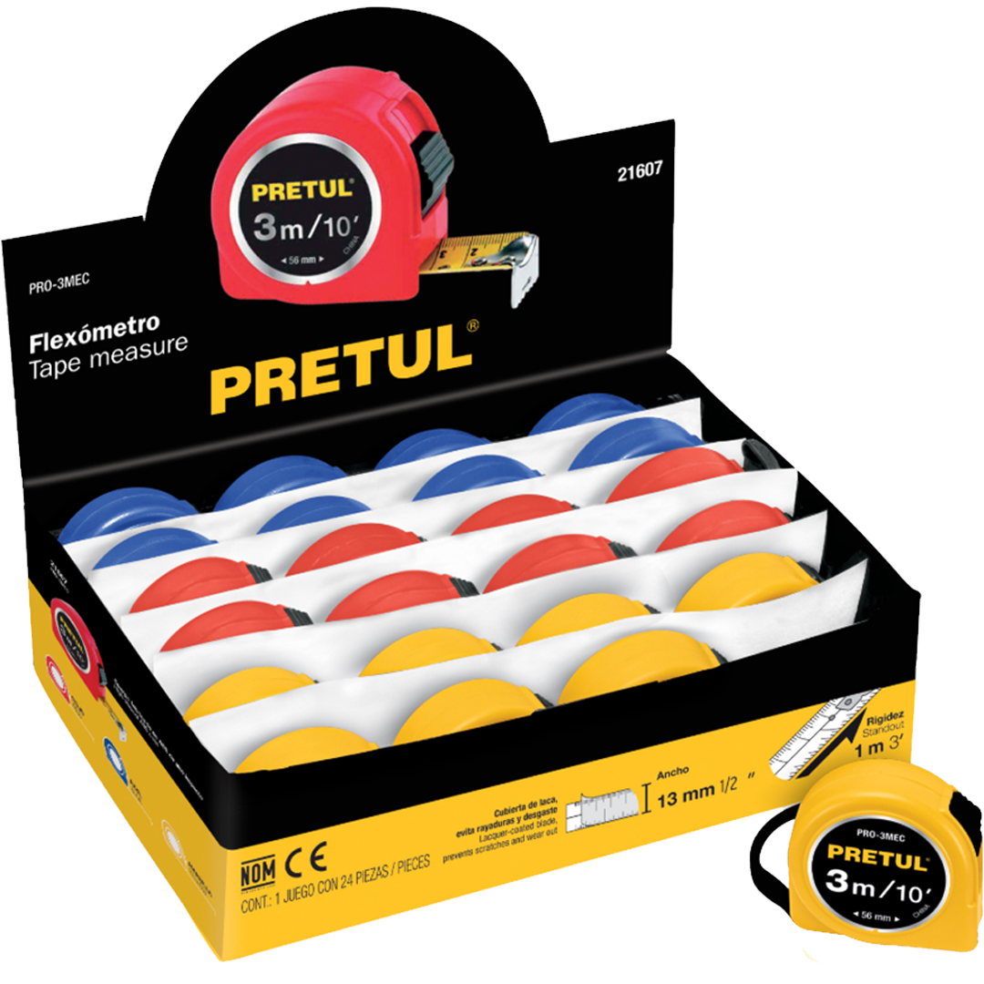 Flexómetro 3 m cinta 13 mm, display box con 24 pzas, Pretul