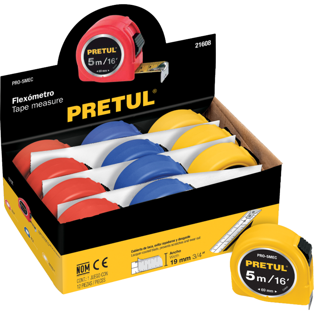 Flexómetro 5 m cinta 19 mm, display box con 12 pzas, Pretul 21608
