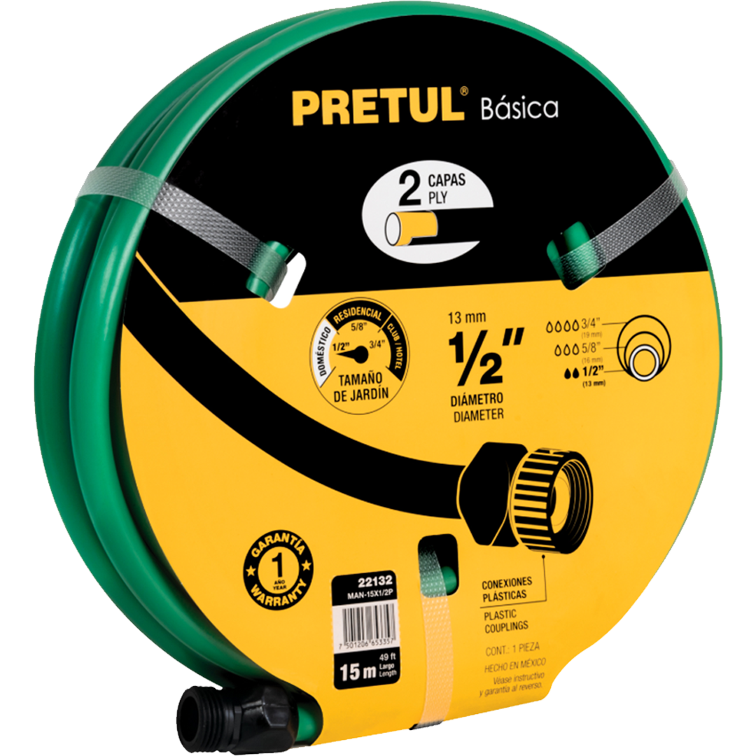 Manguera verde 1/2' 2 capas 15m conexiones plásticas, Pretul 22132